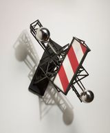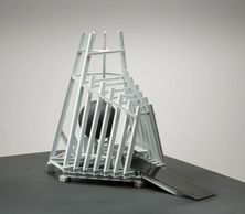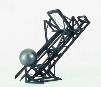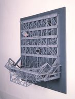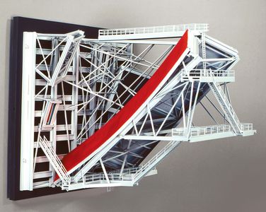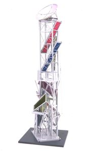 "A very complex piece using various ladder, walkways and staircases with reflected colors in billboard structures. This piece was accidentally destroyed in shipment while in a traveling show.