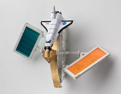 This is a part of my designs for a series of outer space sculptures that would perform certain duties beyond the aesthetics natural of the works with colorful solar panels as a functional station. Collection of the Artist